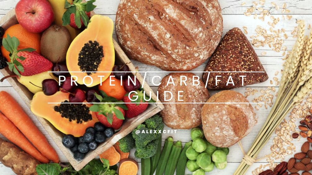 Easy to read reference guide for healthy protein, carb, and fat choices with serving size.